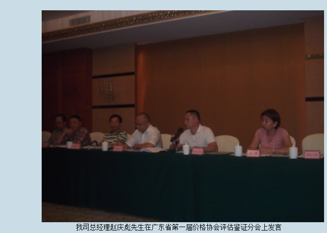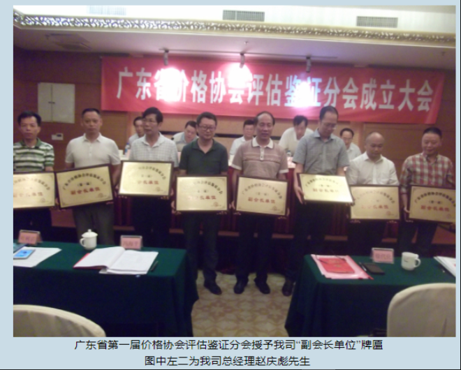 2015年10月,广东省第一届价格协会评估鉴证分会于在肇庆碧桂园大酒店隆重举行。我公司荣获“副会长单位”,公司总经理赵庆彪先生当选为协会副会长。能获此荣誉是行业及协会对我司近年来工作成绩的充分肯定,今后我司必在广东省价格协会的领导下,率先加强行业自律,严格规范企业行为,勇于创新服务。并凝聚行业力量,搭建合作平台,整合行业资源,促进企业间互相学习,交流合作,共同发展。同时努力维护好会员的合法权益,反映会员的合理诉求,积极向政府建言献策,为促进行业的发展贡献绵薄之力。